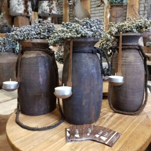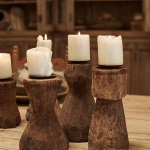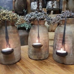 Deze kandelaars, geïnspireerd op traditionele potvormen, hebben een robuuste en decoratieve uitstraling. Perfect om een rustieke sfeer te creëren in de woonkamer of eetkamer.