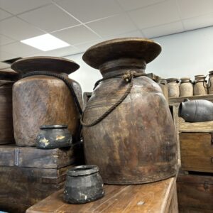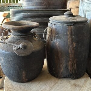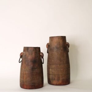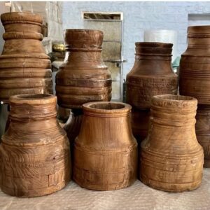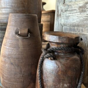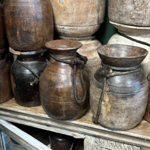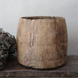 Houten Indian potten zijn met de hand gemaakt en vaak afkomstig van oude gebruiksvoorwerpen uit India, zoals waterkruiken of opslagpotten. Ze hebben een rustieke en verweerde uitstraling, waarbij de unieke houtnerven en patina elk stuk een eigen karakter geven. De potten variëren in grootte en vorm, van smalle cilindrische modellen tot brede, ronde designs.