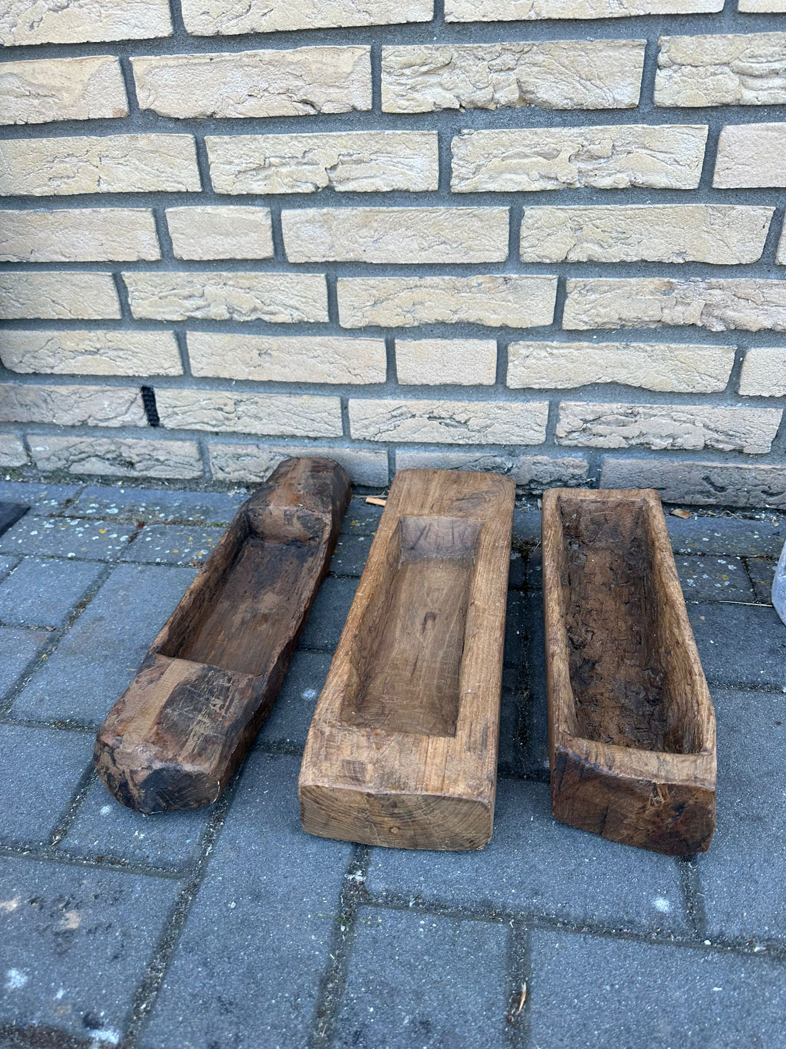 Deze robuuste, met de hand uitgehouwen houten trog werd vroeger gebruikt in landelijke Indiase keukens.