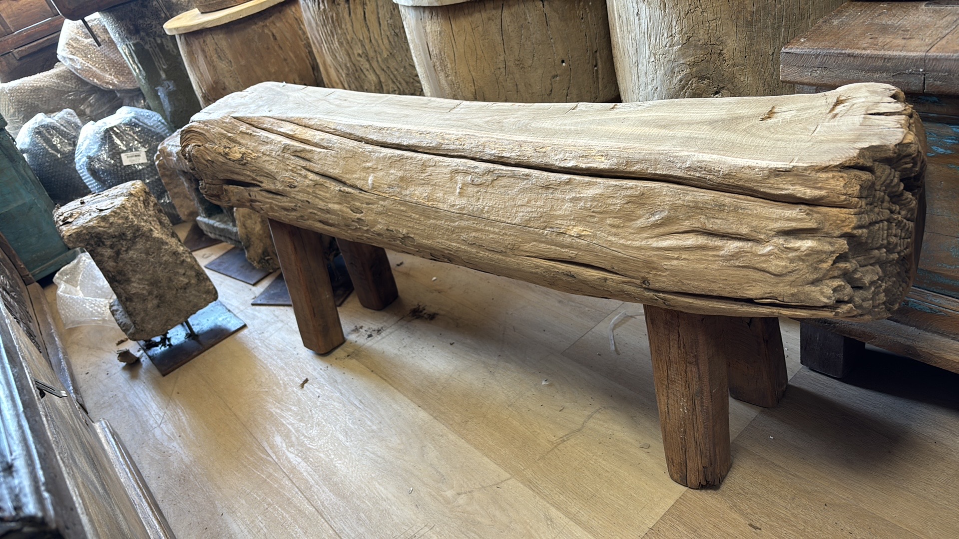 Dit karaktervolle bankje is gemaakt van oud sleeper wood – sterk, zwaar hout afkomstig van Indiase spoorbielzen.