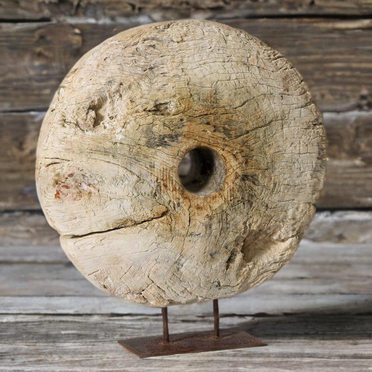 Het oude karwiel, vaak afkomstig uit traditionele Indiase wagens, is zorgvuldig bewerkt en geplaatst op een stevige standaard voor extra stabiliteit en visuele impact. Dit unieke stuk voegt niet alleen een vleugje geschiedenis toe, maar is ook een opvallend element dat een tijdloze charme en ambachtelijke schoonheid in elke ruimte brengt.