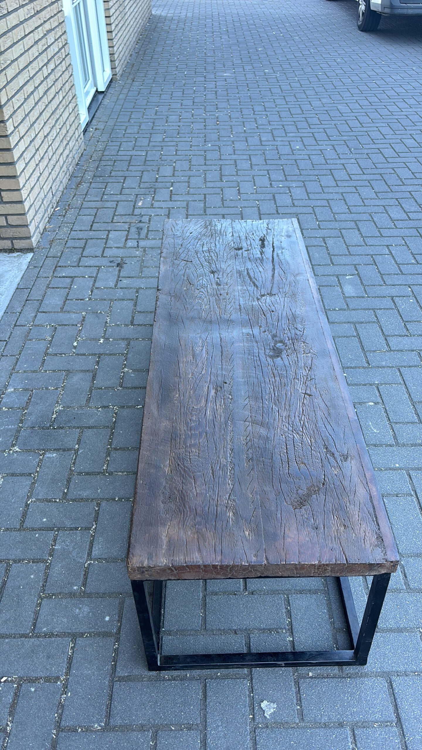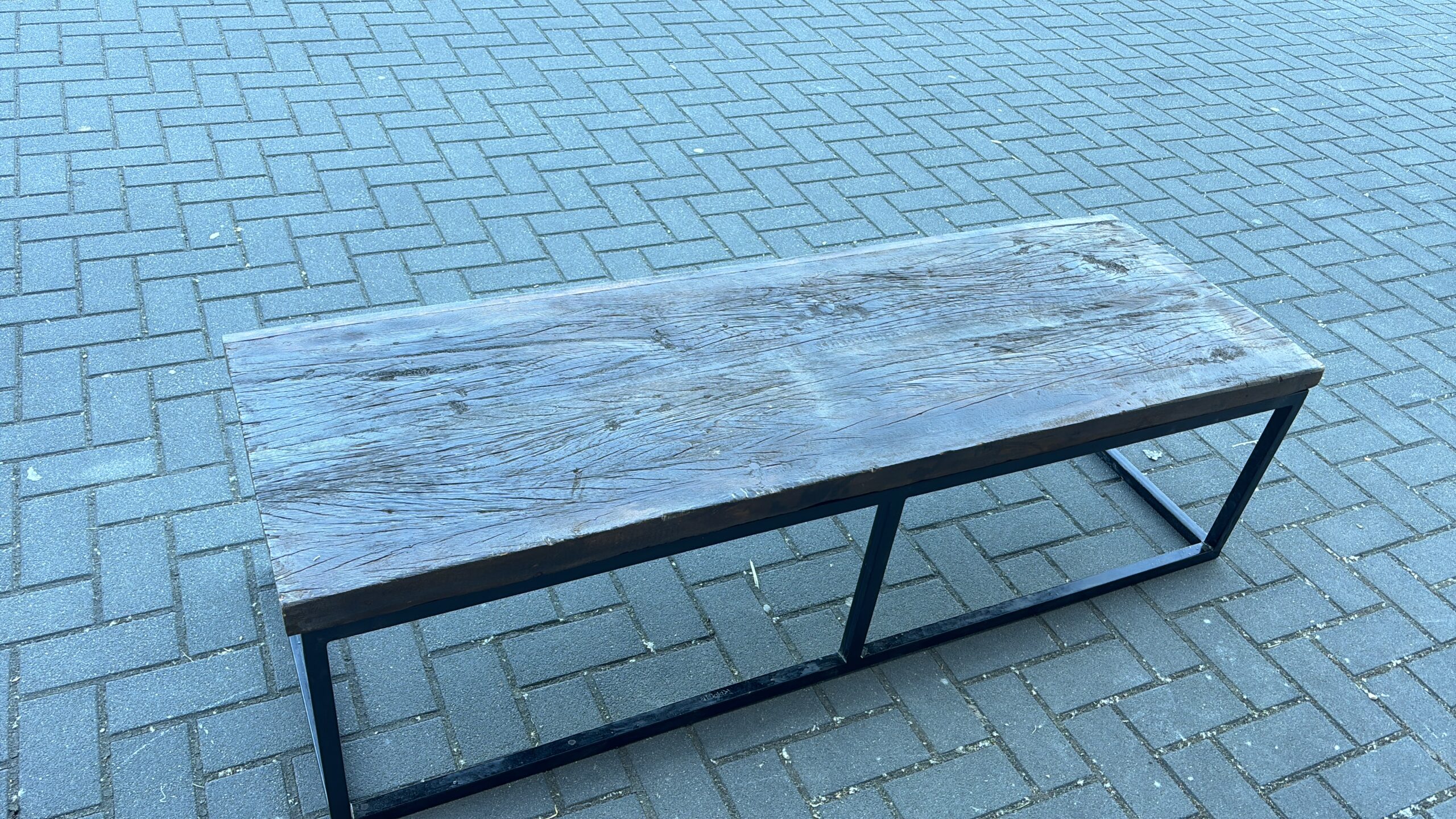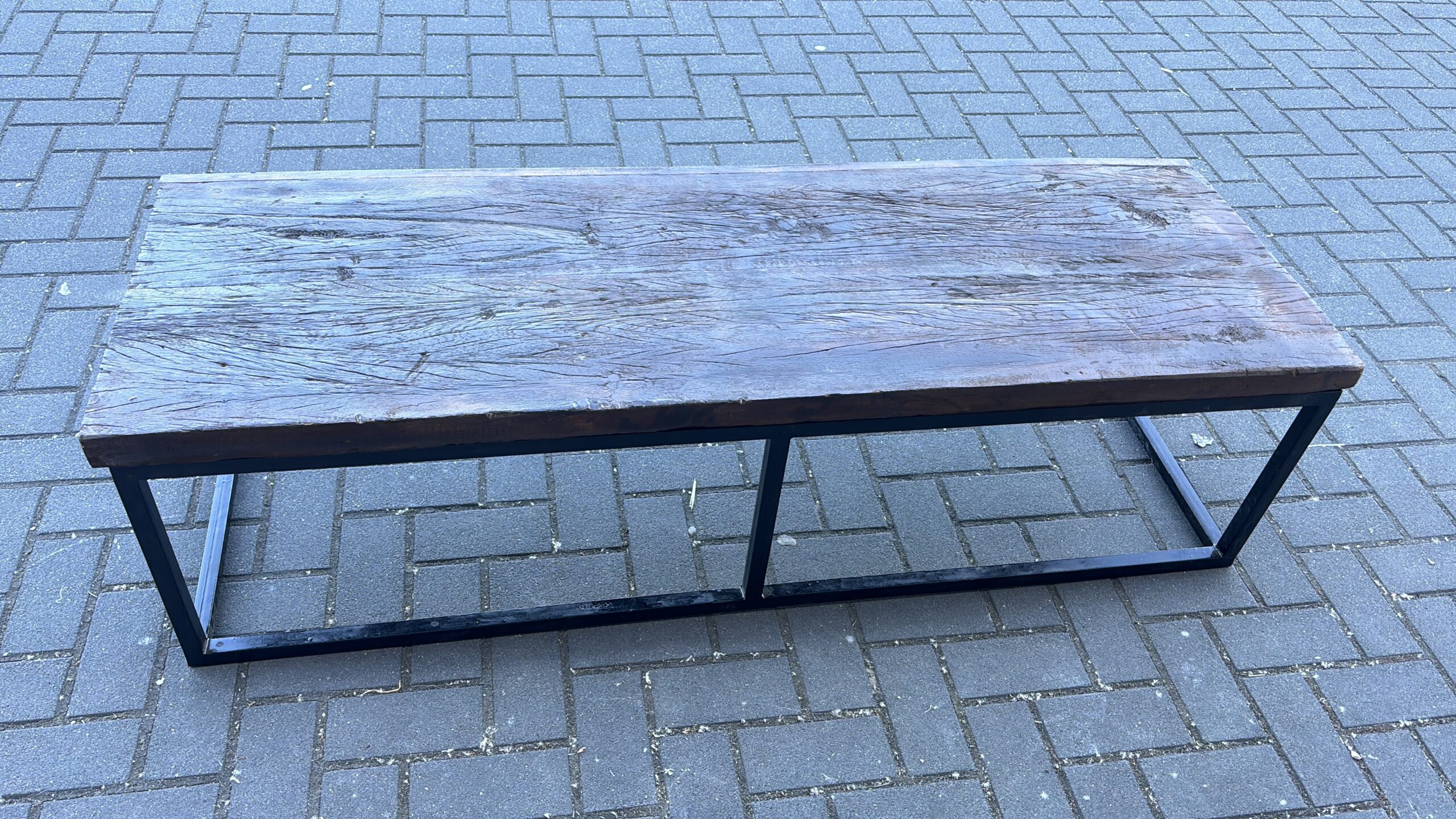 Een stijlvolle mix van oud en nieuw: deze koffietafel combineert een authentiek, antiek bovenblad uit India met een strak zwart gespoten onderstel.
