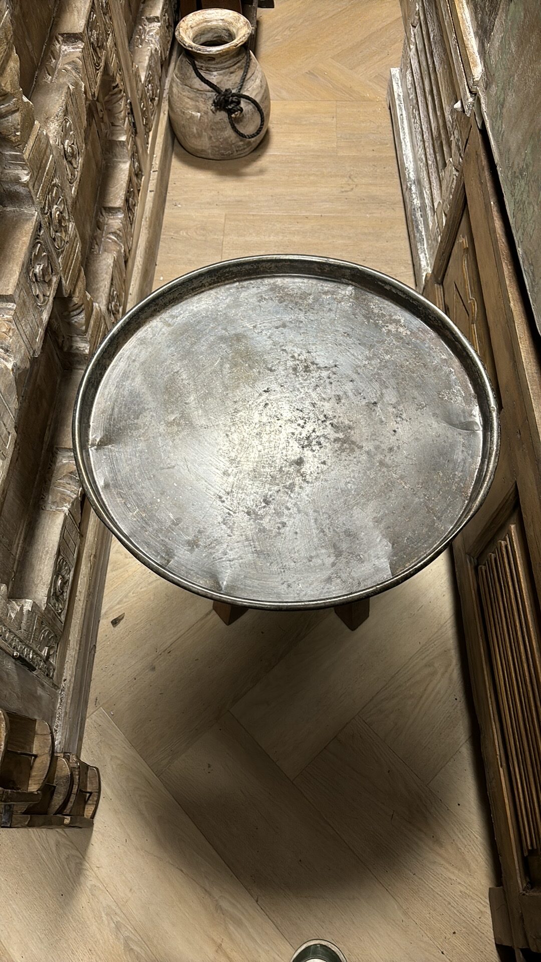 Deze sierlijke metalen schaal, met verfijnde Indiase details, is een prachtig decoratief object.