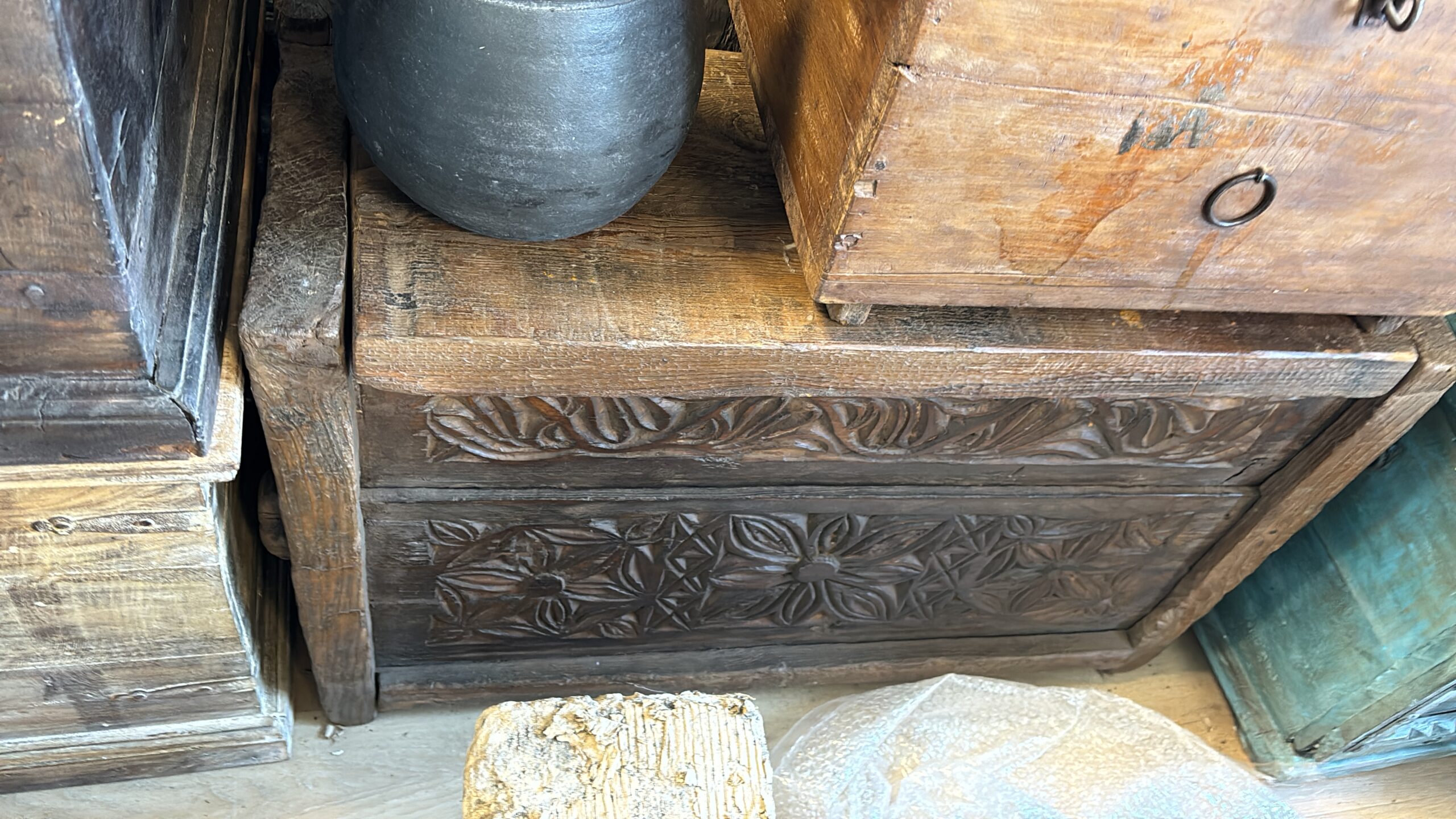 Deze opbergkist is met de hand bewerkt en voorzien van prachtige houtsnijwerken, typisch voor traditioneel Indiaas vakmanschap.