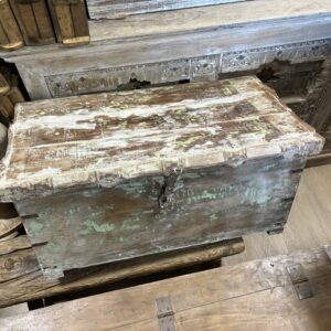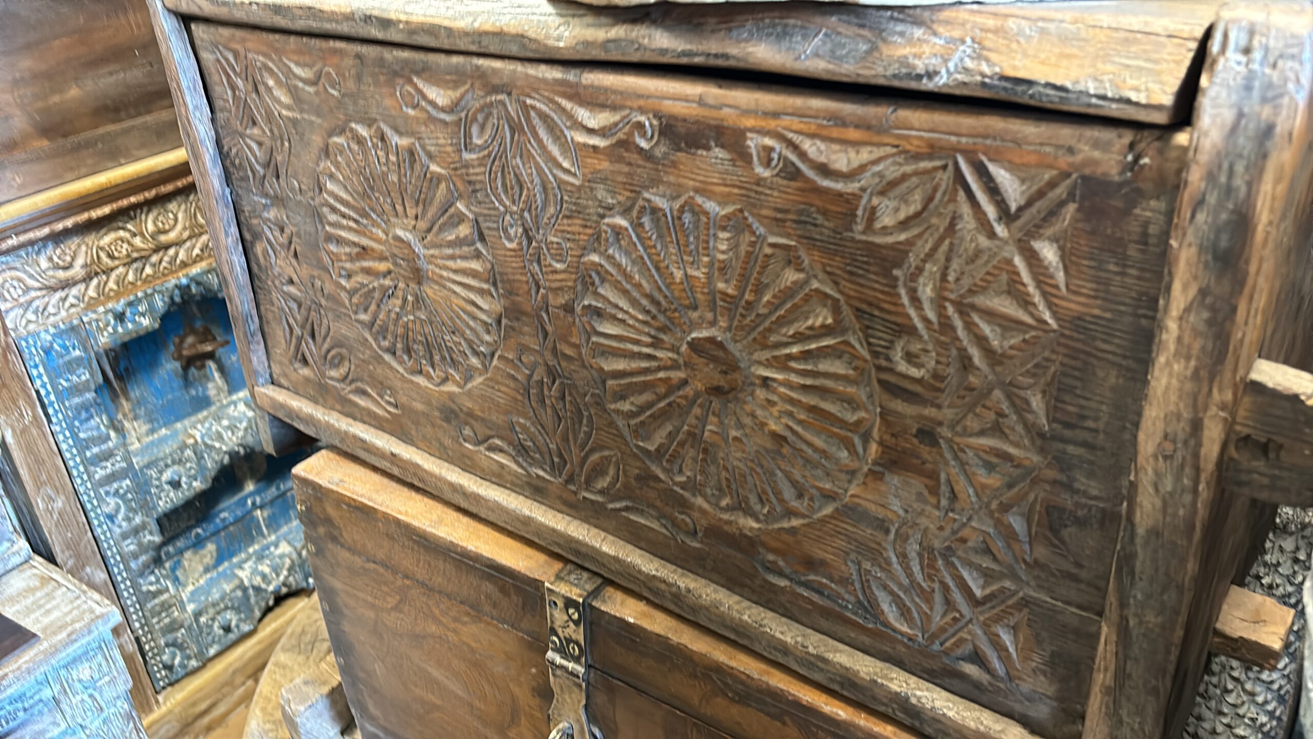 Deze opbergkist is met de hand bewerkt en voorzien van prachtige houtsnijwerken, typisch voor traditioneel Indiaas vakmanschap.