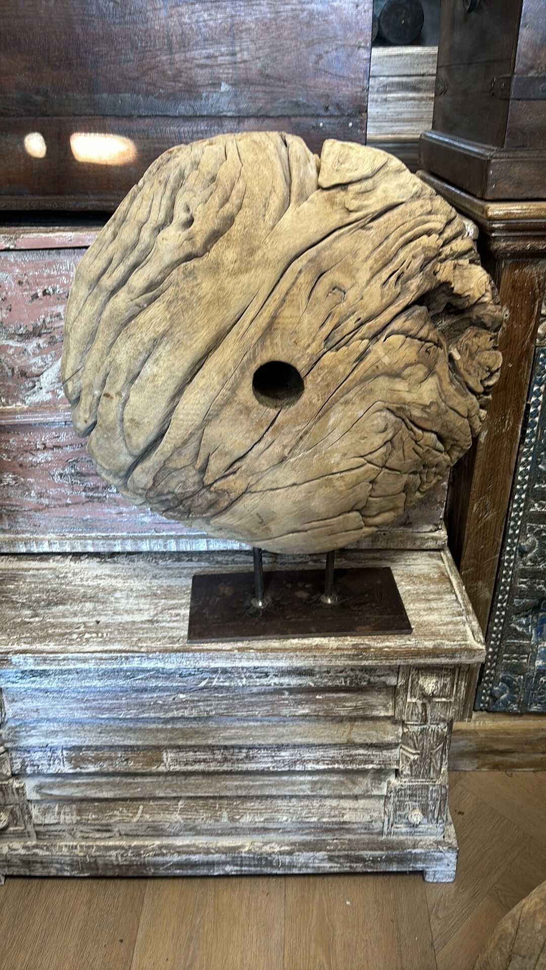 Een uniek decoratief object: een authentiek marktwagenwiel uit India, geplaatst op een robuuste standaard.
