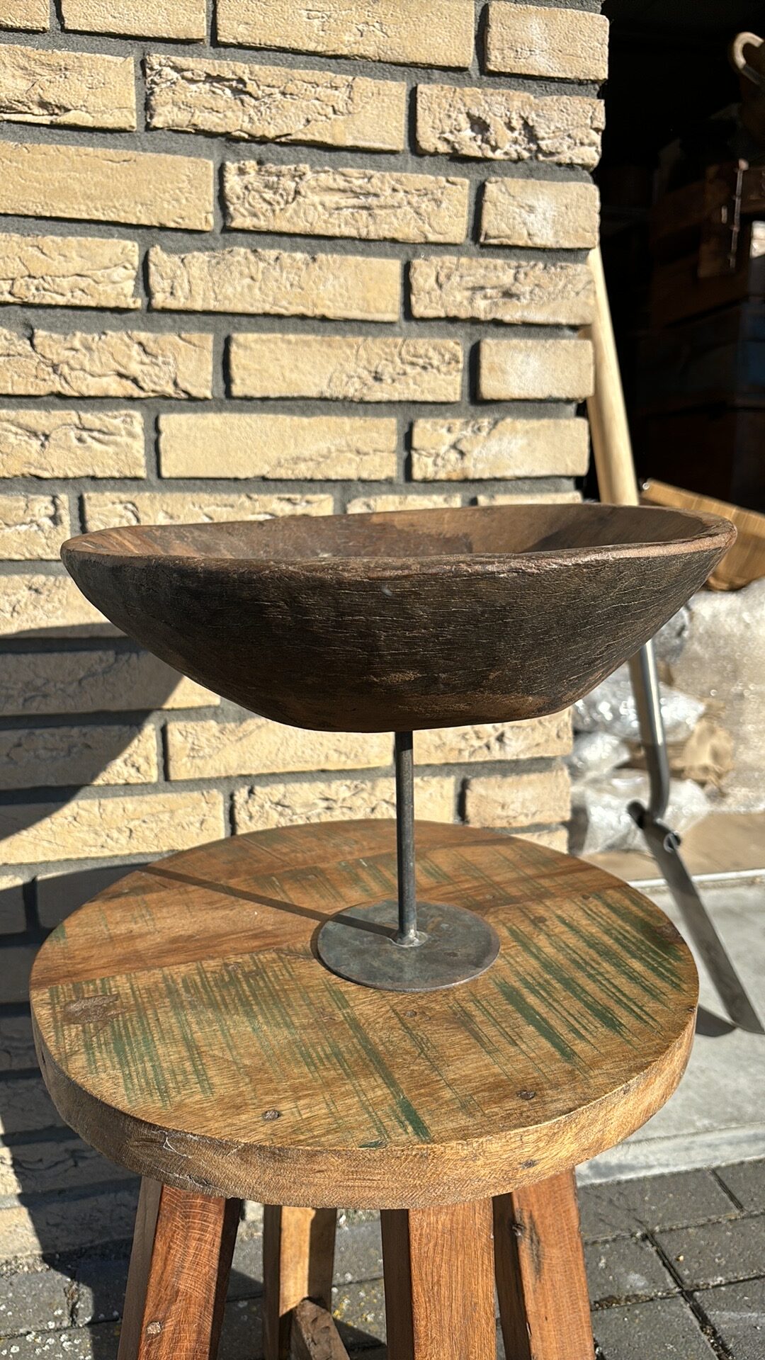 Een elegant handgemaakt object uit India: een schaal met een robuuste standaard.