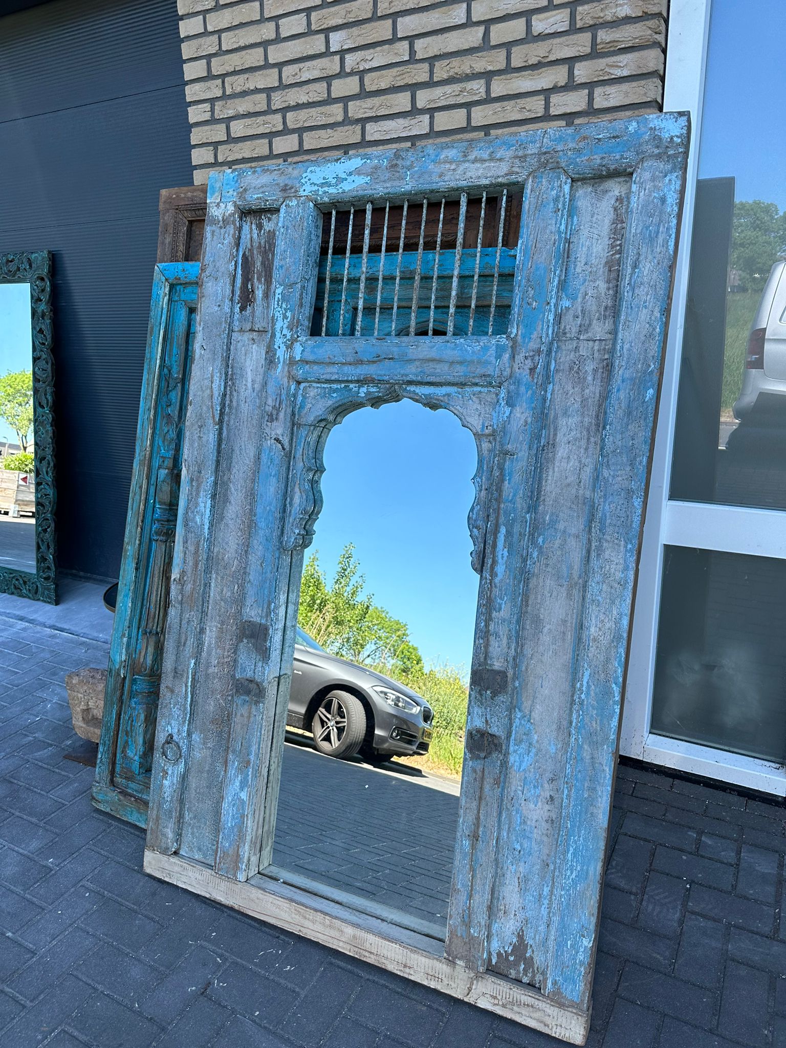 Een imposante handgemaakte spiegel uit India, omlijst met een robuust vintage houten frame.