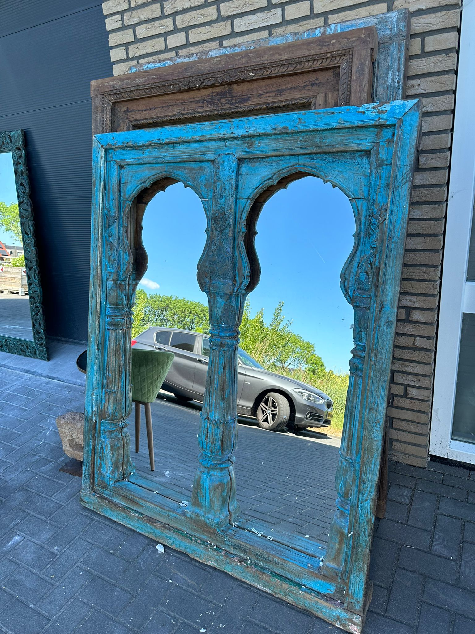 Een royale, handgemaakte spiegel uit India met een robuust houten frame.