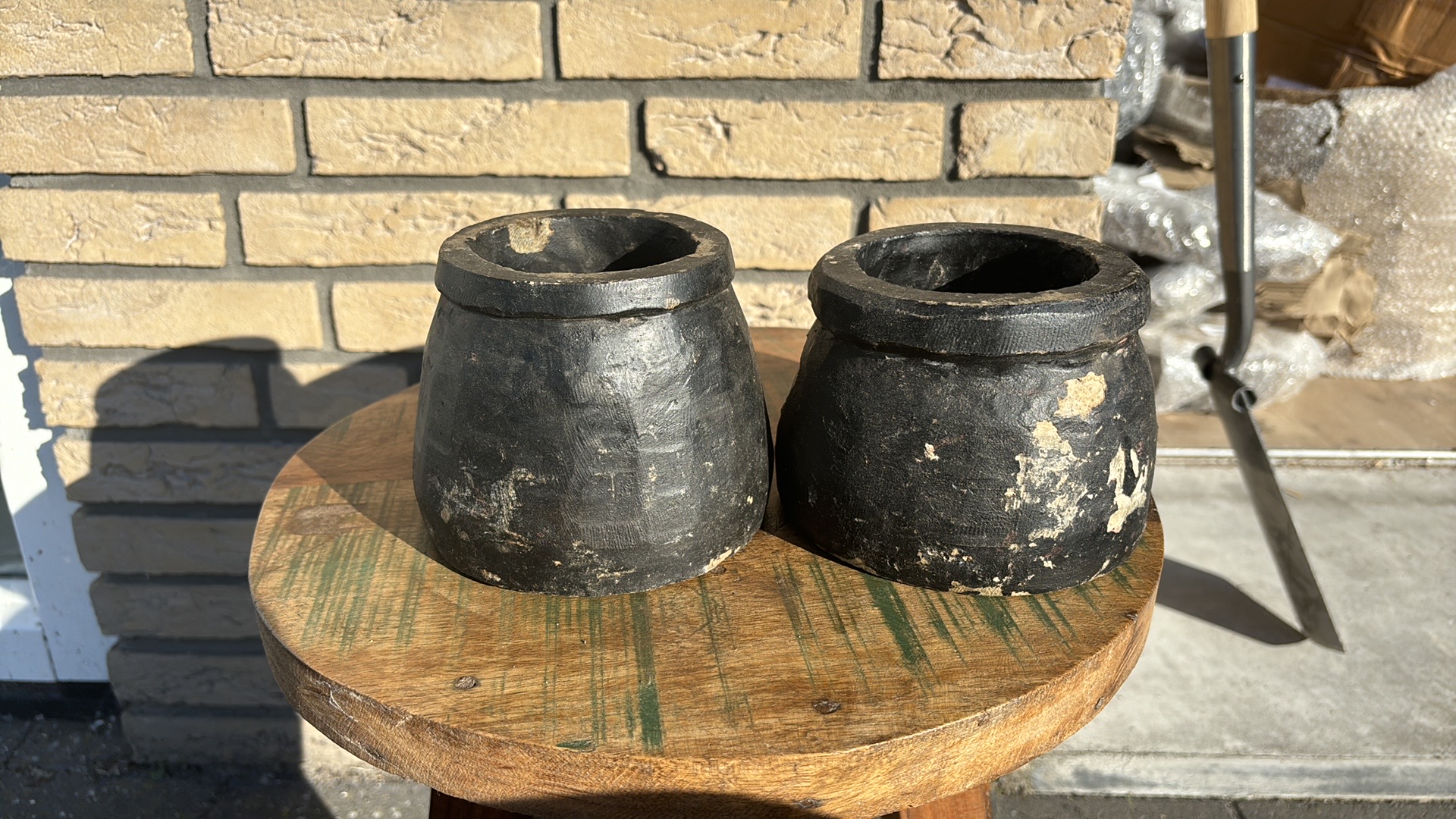 Een robuuste, handgemaakte pot uit India, vervaardigd uit natuursteen.